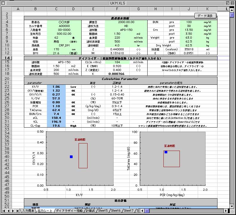 この解析シートでは、至適透析を検討する際に重要なパラメータであるUrea kineticsの各パラメータを計算、グラフ化するソフトです。